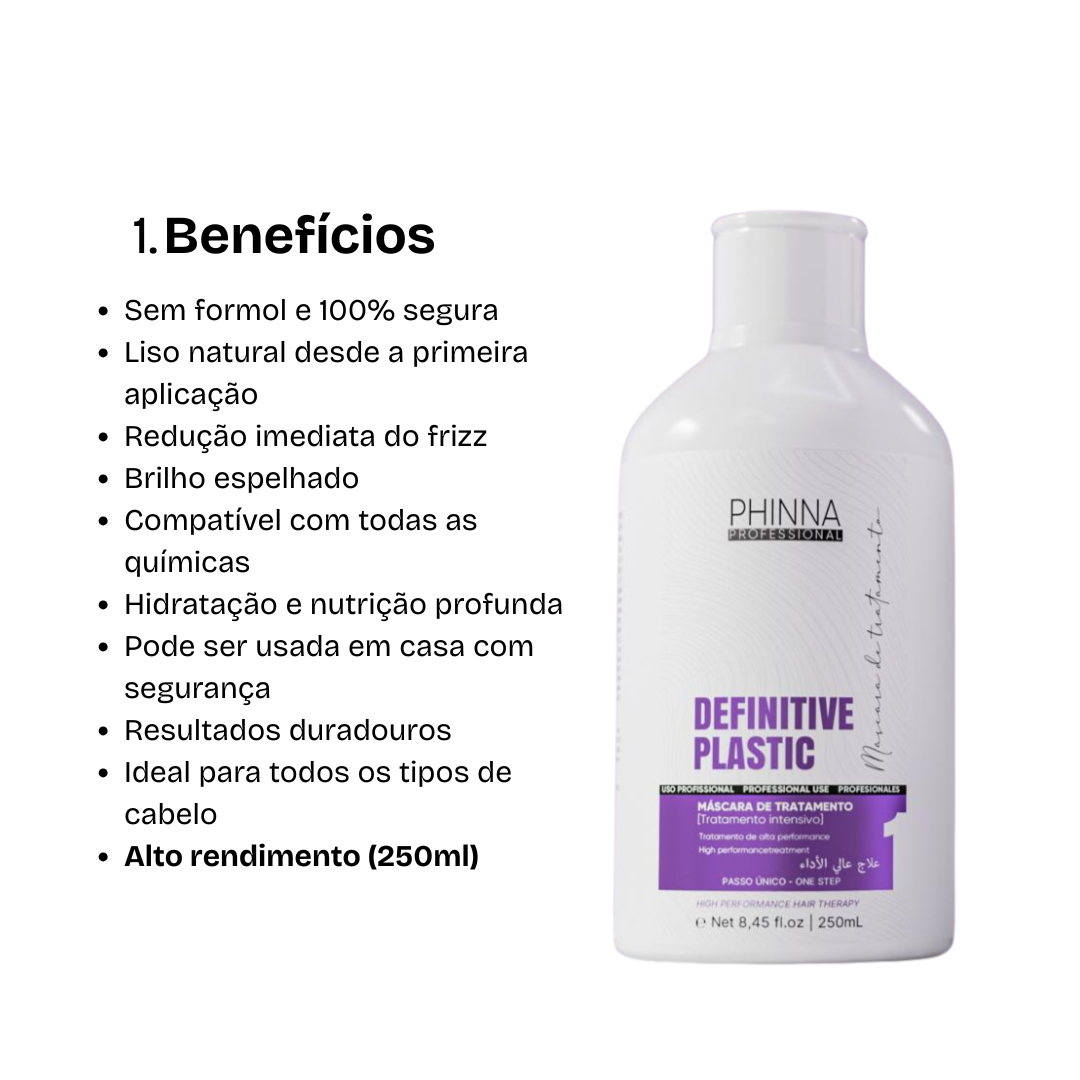 A Definitive Plastic realinhamento capilar, possui em sua fórmula uma combinação de Ácido Lático, Manteiga de Murumuru, óleo de semente de Tucumã, Poliquartenium-07 e 37, que transformam cabelos volumosos em com frizz em cabelos com brilho, sedosos e sem volume.
